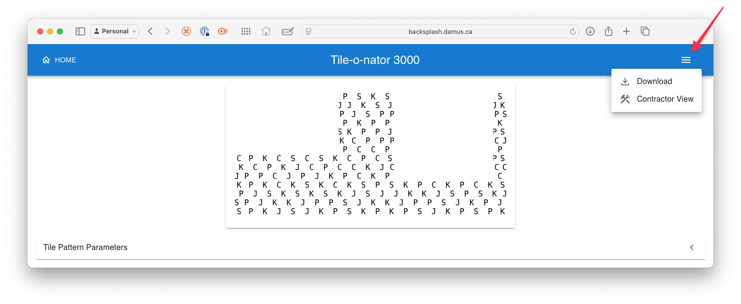 Whereas this is a nice, tidy summary of the backsplash design, it’s more information than is needed by the contractor to implement it, and not convenient for printing to share with them. To that end, the Export screen has additional sharing options: a Download function that drops a JSON file with all of the configuration parameters in your Downloads folder to share with somebody else (use the Upload button in the settings window to load the configuration), and the Contractor View.